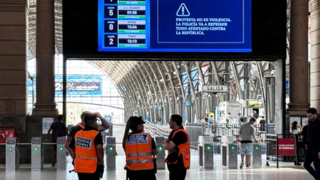 "Protesta no es violencia. La Policía va a reprimir todo atentado contra la República", es el mensaje completo, y acompañado con un símbolo de peligro, que se reproduce en pantallas y altavoces en las estaciones de trenes que conectan la capital con el área metropolitana de Buenos Aires.