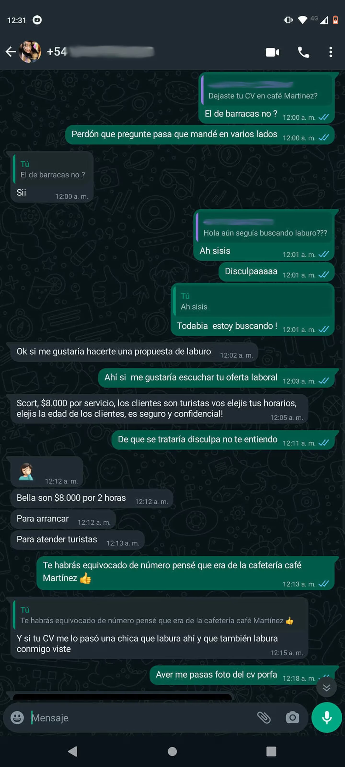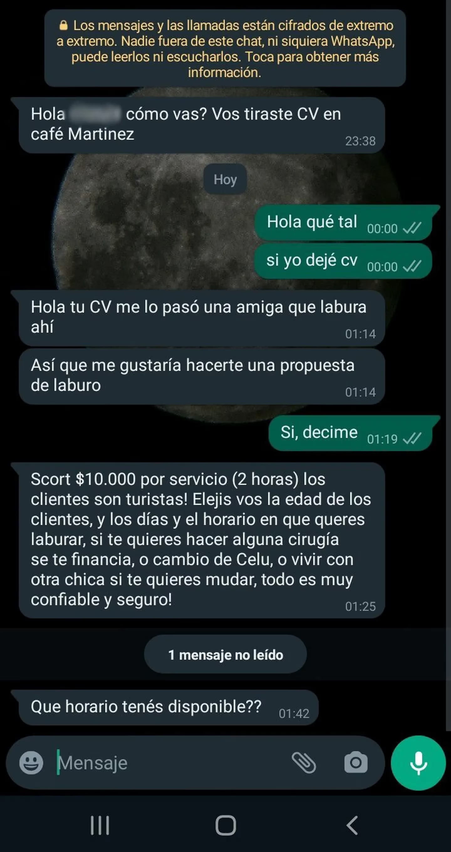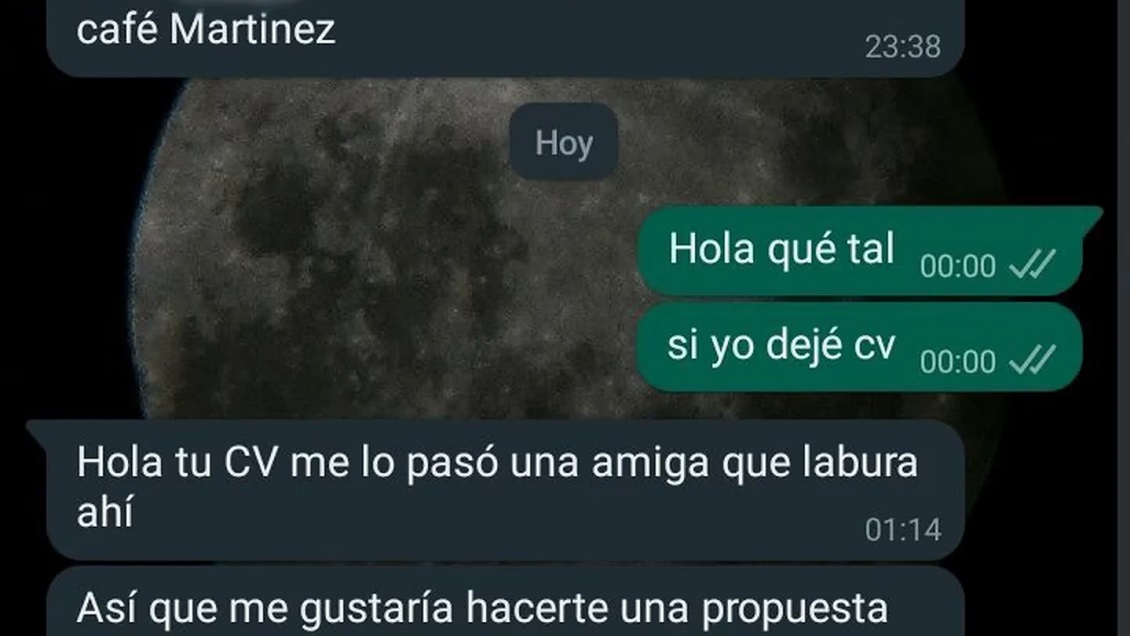 La mujer contó que llevó su CV a la sucursal de una cadena de cafés y, días después, recibió un mensaje de un número desconocido por WhatsApp, que le ofreció ser escort.