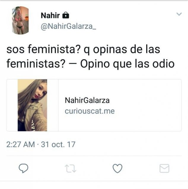 Medios argentinos revelaron las respuestas de Nahir Galarza en curiouscat, un sitio web donde usuarios responden a cualquier tipo de pregunta que les hagan sus seguidores de redes sociales. La mediática joven, condenada a cadena perpetua por matar a su pololo Fernando Pastorizzo, incluso criticó al feminismo, subió una presunta fotografía desnuda y aseguraba mediante este medio estar soltera.