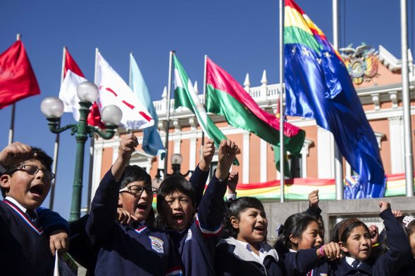 Conoce la bandera de la "reivindicación marítima" de Bolivia Publicado: Lunes, 4 de Mayo de 2015 3 de 6 Este lunes Evo Morales izó la bandera de la reivindicación marítima, en el inicio de los alegatos de Chile en La Haya. Conócela acá. Este lunes Evo Morales izó la bandera de la reivindicación marítima, en el inicio de los alegatos de Chile en La Haya. Conócela acá.UNO