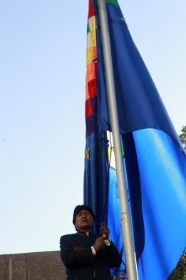Conoce la bandera de la "reivindicación marítima" de Bolivia Publicado: Lunes, 4 de Mayo de 2015 5 de 6 Este lunes Evo Morales izó la bandera de la reivindicación marítima, en el inicio de los alegatos de Chile en La Haya. Conócela acá. Este lunes Evo Morales izó la bandera de la reivindicación marítima, en el inicio de los alegatos de Chile en La Haya. Conócela acá.EFE