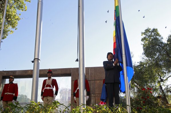 Conoce la bandera de la "reivindicación marítima" de Bolivia Publicado: Lunes, 4 de Mayo de 2015 6 de 6 Este lunes Evo Morales izó la bandera de la reivindicación marítima, en el inicio de los alegatos de Chile en La Haya. Conócela acá. Este lunes Evo Morales izó la bandera de la reivindicación marítima, en el inicio de los alegatos de Chile en La Haya. Conócela acá.EFE