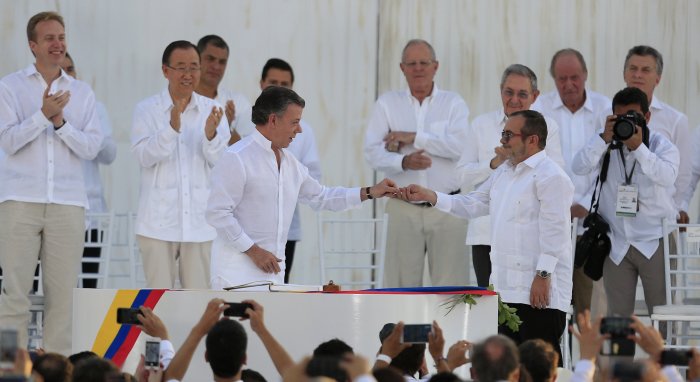 El presidente de Colombia, Juan Manuel Santos y el máximo líder de las Fuerzas Armadas Revolucionarias de Colombia (FARC), Rodrigo Londoño Echeverri, alias "Timochenko", firmaron este lunes el acuerdo de paz que pone fin a más de medio siglo de conflicto armado.