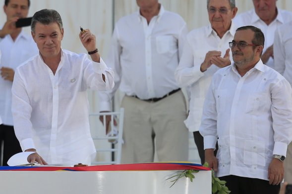 El presidente de Colombia, Juan Manuel Santos y el máximo líder de las Fuerzas Armadas Revolucionarias de Colombia (FARC), Rodrigo Londoño Echeverri, alias "Timochenko", firmaron este lunes el acuerdo de paz que pone fin a más de medio siglo de conflicto armado.
