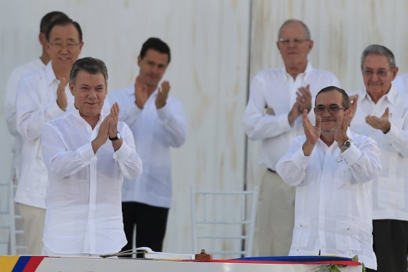 El presidente de Colombia, Juan Manuel Santos y el máximo líder de las Fuerzas Armadas Revolucionarias de Colombia (FARC), Rodrigo Londoño Echeverri, alias "Timochenko", firmaron este lunes el acuerdo de paz que pone fin a más de medio siglo de conflicto armado.