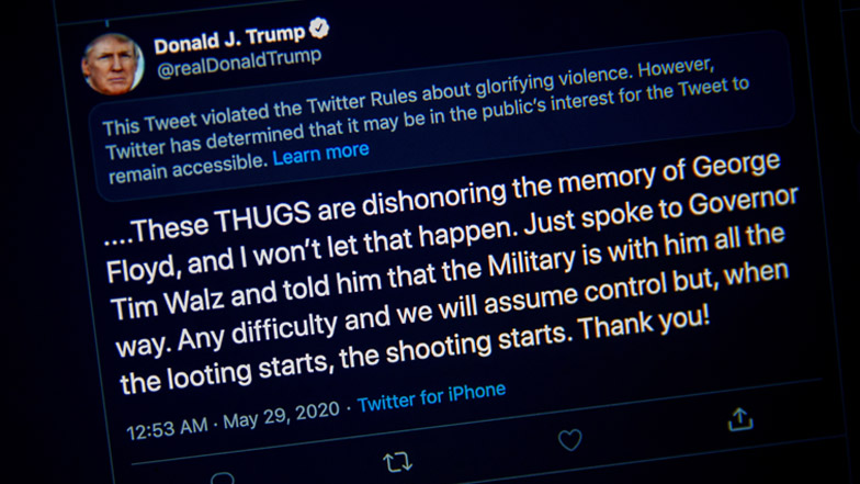 El tuit de Trump que Twitter etiquetó por "glorificar la violencia".
