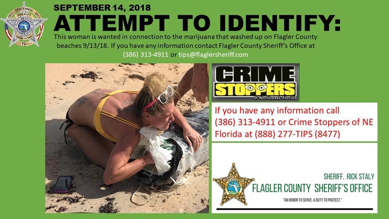 Las autoridades de Florida buscan a una mujer rubia que aparece en una foto donde se le ve en bikini y abrazando un gran paquete de marihuana que salió a flote tras el paso del huracán Florence por Las Carolinas, informaron este miércoles medios locales.