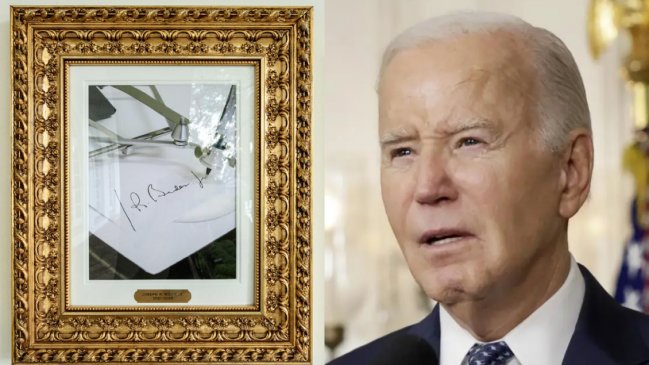 La imagen que correspondería a Biden, colgada en septiembre, es, sin embargo, una fotografía de un bolígrafo automático, en alusión a que Trump considera que su antecesor no sabía lo que firmaba.