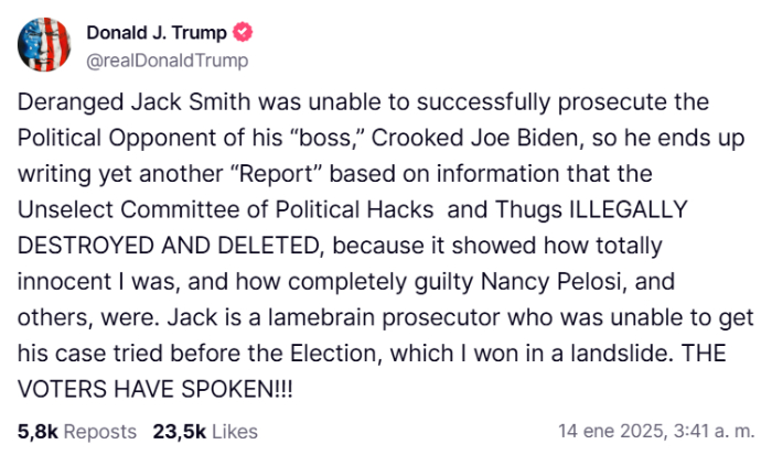 "Jack es un fiscal descerebrado que no pudo lograr que su caso fuera juzgado antes de las elecciones, que gané de manera aplastante. ¡¡¡LOS VOTANTES HAN HABLADO!!!", concluyó Trump.