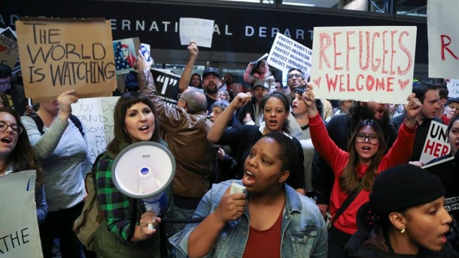 Las movilizaciones continuaban también en muchos aeropuertos, como el de Dulles en Washington y el de Los Ángeles, donde centenares de personas se dieron cita coreando consignas como "El amor, no el odio, es lo que hace grande a Estados Unidos", y portando pancartas como "No al veto. No al muro".