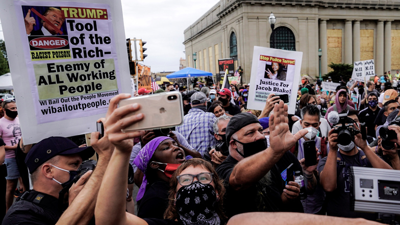 Trump llegó a la ciudad que ha sido escenario de protestas después de conocerse el incidente que dejó a Blake recluido en un hospital, desoyendo los pedidos del alcalde local, el demócrata John Antaramian, y el gobernador de Wisconsin, Tony Evers, de que evitara azuzar a los manifestantes.