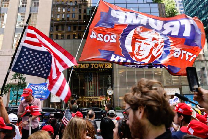 Alrededor de un centenar de trumpistas se concentró este viernes frente a la Torre Trump en Nueva York mientras el expresidente, hallado culpable el jueves por la vía penal de 34 delitos de falsificación documental, ofrecía en este edificio una rueda de prensa sobre el veredicto.