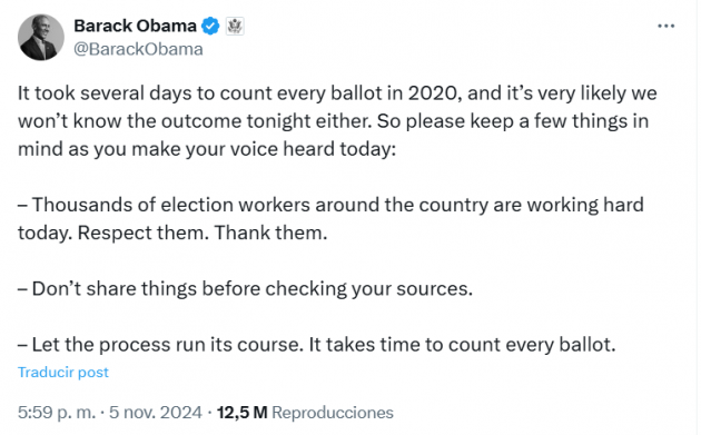 19:49 - | Barack Obama pide paciencia: "Llevó varios días contar cada voto en 2020, y es muy probable que no sepamos el resultado esta noche tampoco. Así que por favor tengan en cuenta unas cuantas cosas mientras hoy hacen oír sus voces"