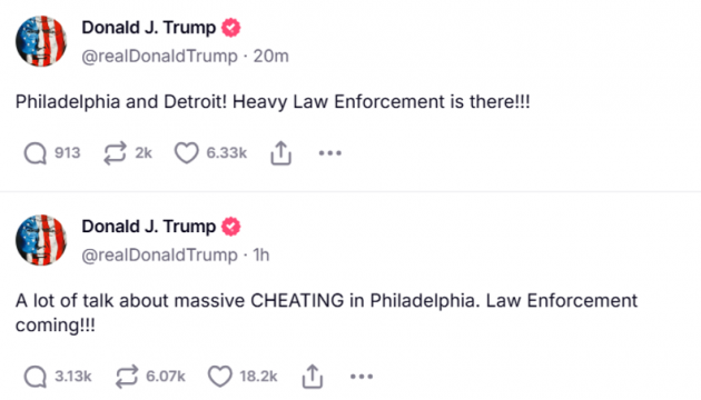 21:05 - | "Hay muchos comentarios de TRAMPAS masivas en Filadelfia. ¡¡¡Se acerca la aplicación de la ley!!!", dijo Trump en su red, Truth Social. Sin embargo, el Departamento de Policía de Filadelfia dijo no estar al tanto de los supuestos hechos denunciados por el magnate. Según comentó a la cadena CNN, no estaban al corriente de ningún problema con la votación que haya requerido una actuación policial