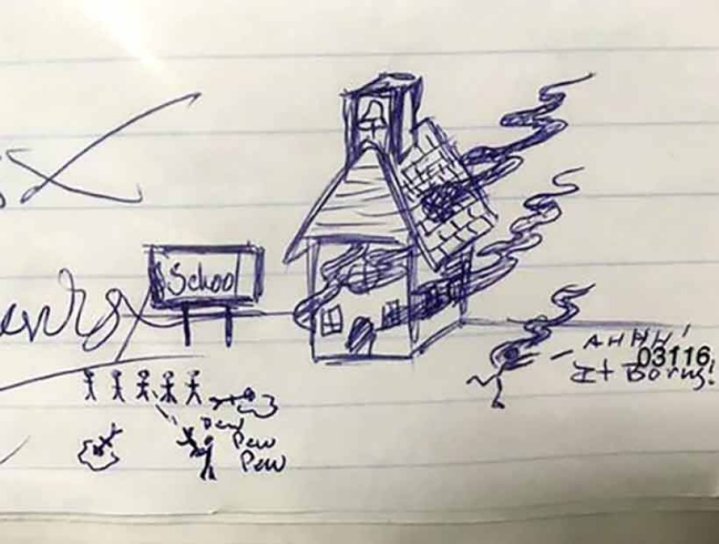 Realizó una violenta ilustración en que se observan, entre otras cosas, una escuela incendiándose y cinco alumnos esperando ser fusilados.