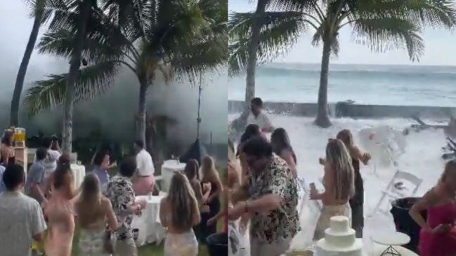 En un video compartido por uno de los invitados, se puede ver cómo algunos de los asistentes comienzan a tomar distancia a medida que la ola se aproxima. Segundos después, el agua impactó en el lugar, derribando todo a su paso.