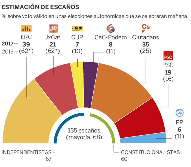 El diario El País publicó un sondeo que otorga a esas tres fuerzas un 46 por ciento de los votos, mismo porcentaje que a los partidos constitucionalistas, los liberales de Ciudadanos, los socialistas del PSC y el centroderecha del PPC.