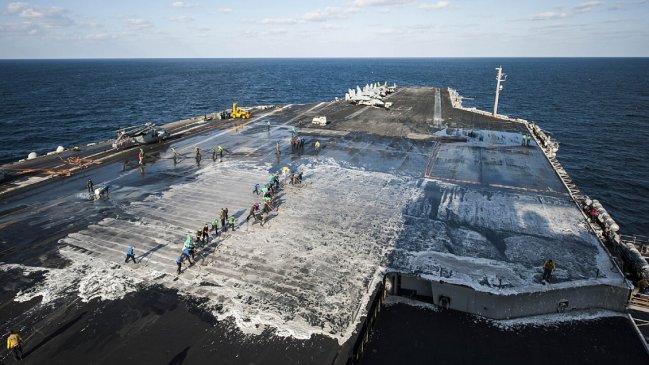 El incidente, donde un marine "sufrió una herida leve", se produjo mientras el caza F/A-18E Super Hornet era remolcado por la superficie del navío. "La aeronave y el vehículo de remolque se perdieron por la borda", especifica el breve texto.