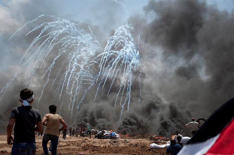 Manifestantes palestinos han protagonizado protestas este lunes, convocadas por todas las facciones en el marco de la Marcha del Retorno que se han hecho coincidir con el traslado de la Embajada de EE.UU. a Jerusalén. Los palestinos muertos por fuego israelí ascienden ya a 41 y la cifra de heridos se eleva a 1.960, entre ellos 200 menores.