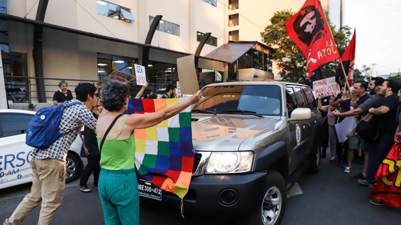 "'Almugre' asesino" o "Almagro, tus manos tienen sangre boliviana" eran algunos de los mensajes que se podían leer en los carteles de los manifestantes, que también ondeaban banderas de las juventudes comunistas, con el rostro de Ernesto 'Che' Guevara y la whipala, bandera que representa la diversidad cultural del país, considerada un símbolo patrio por la Constitución promulgada en 2009 por Morales.