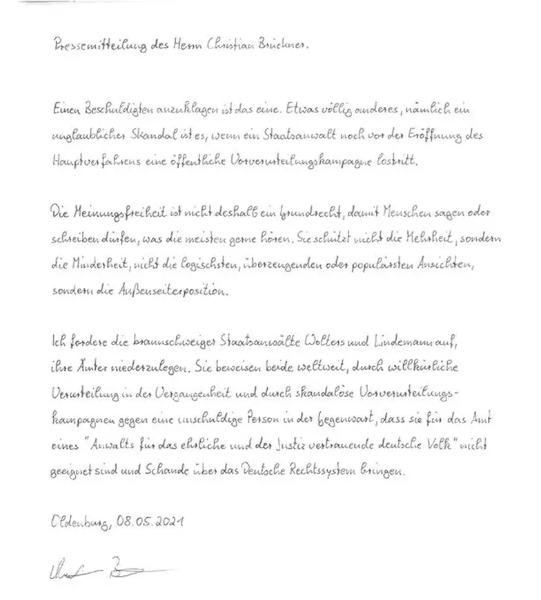 En la misiva, con fecha de mayo, arremetió contra el fiscal jefe de Braunschweig, Christian Wolters, quien lo acusa de presuntamente haber secuestrado y asesinado a la pequeña de entonces tres años.