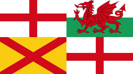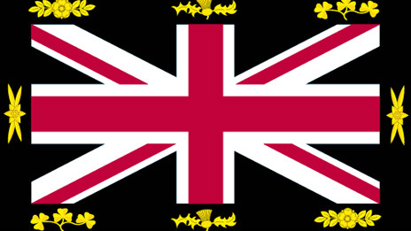 Bajo el mismo principio, la cuarta elimina el blanco del aspa de San Andrés y superpone una corona y el estandarte real, incluyendo los tres leones de Inglaterra y el león rojo escocés y el arpa, símbolo de Gales e Irlanda.