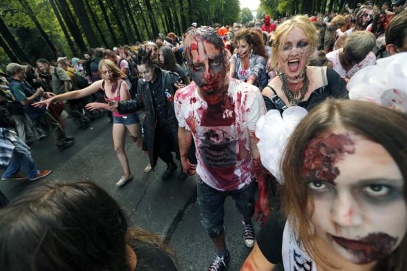 Cientos de personas caracterizados como vampiros y zombies realizaron un masivo flash mob Zombie en el parque central de San Petersburgo en Rusia, mientras en Estocolmo, Suecia, otras decenas de fanáticos hicieron lo propio.