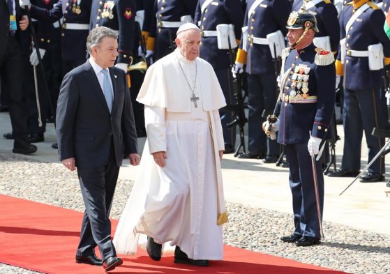 El presidente de Colombia, Juan Manuel Santos, recibió este miércoles con pompa al papa Francisco en la Casa de Nariño, sede del Gobierno, donde mantendrán su primer encuentro oficial.