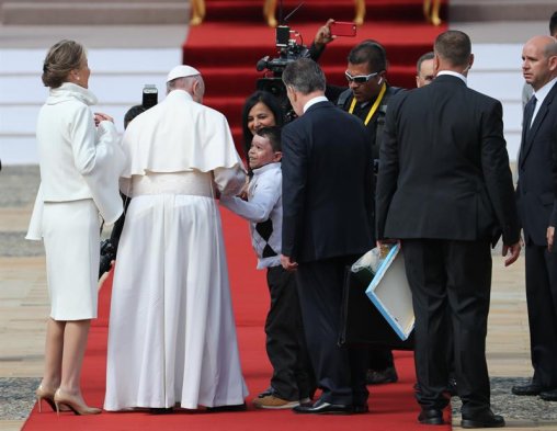El presidente de Colombia, Juan Manuel Santos, recibió este miércoles con pompa al papa Francisco en la Casa de Nariño, sede del Gobierno, donde mantendrán su primer encuentro oficial.