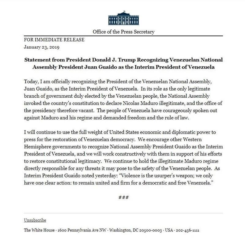 Trump reveló su decisión en un comunicado, minutos después de que Guaidó anunciara que asume las competencias del Ejecutivo venezolano para luchar contra la "usurpación" de la Presidencia por parte de Maduro.