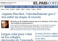 El País tiene en primera línea el titular "Augusto Pinochet extremadamente grave tras sufrir un ataque al corazón". (Cooperativa.cl)