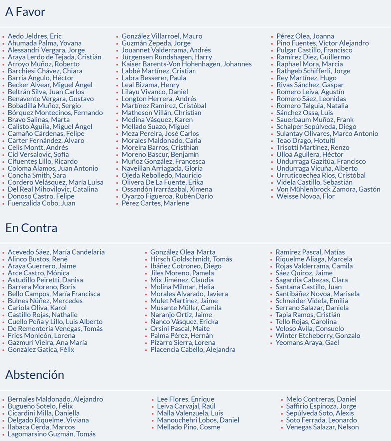 La declaración fue propuesta por la bancada de Renovación Nacional y obtuvo 74 apoyos, de la oposición y la Democracia Cristiana; mientras que 44 legisladores votaron en contra y 16 se abstuvieron, principalmente del oficialismo en ambos casos.