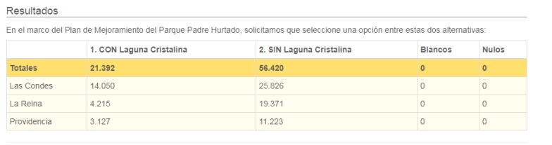 Más de 50 mil vecinos de La Reina, Las Condes y Providencia votaron en contra de la construcción de una laguna artificial en el Parque Padre Hurtado (ex intercomunal) en una consulta pública realizada este domingo.