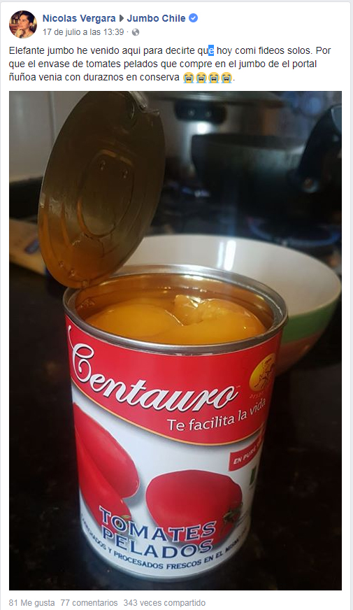Una particular acusación se registró en redes sociales contra la cadena de supermercados Jumbo, luego de que consumidores aseguraron haber comprado en sus locales alimentos en tarros que en realidad contenían otros totalmente diferentes.