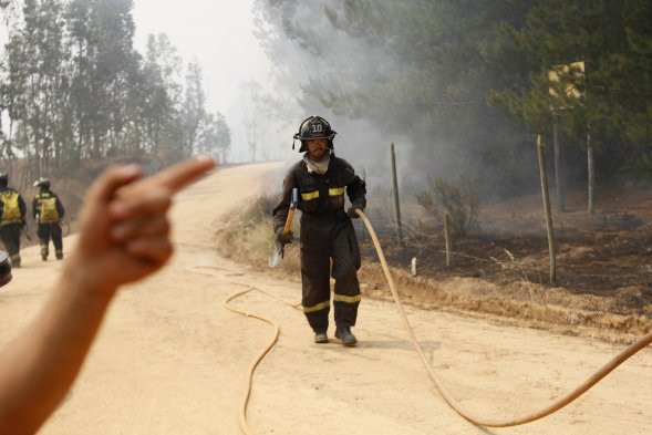 Bomberos trabaja en contener el fuego en un bosque de San Pedro de Alcántara, región de O'Higgins, donde más de 140 mil hectáreas han sido sido consumidas producto de los incendios forestales.