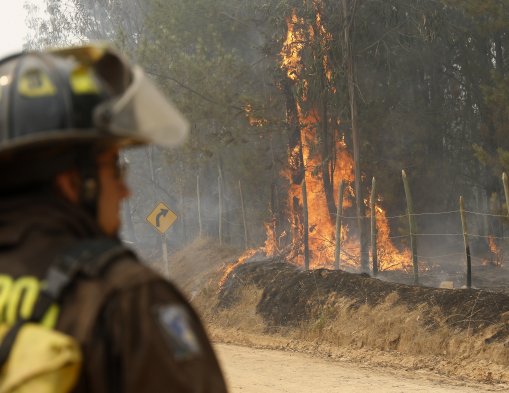 Bomberos trabaja en contener el fuego en un bosque de San Pedro de Alcántara, región de O'Higgins, donde más de 140 mil hectáreas han sido sido consumidas producto de los incendios forestales.