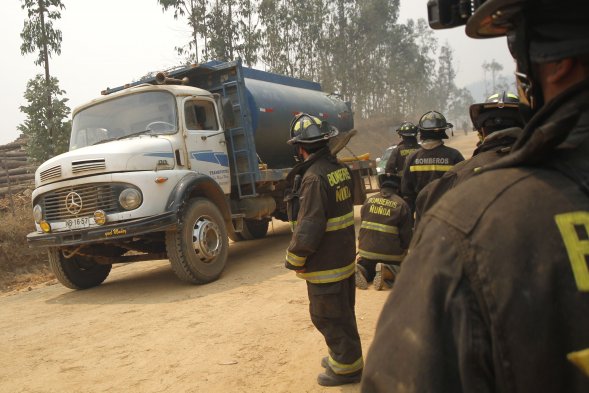 Bomberos trabaja en contener el fuego en un bosque de San Pedro de Alcántara, región de O'Higgins, donde más de 140 mil hectáreas han sido sido consumidas producto de los incendios forestales.