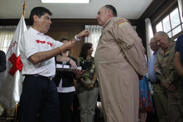 El presidente de Cruz Roja Chilena, Patricio Acosta, condecoró a toda la tripulación del SuperTanker, avión Boeing 747 que cooperó activamente en el combate de los incendios forestales que afectaron al sector centro sur del país.