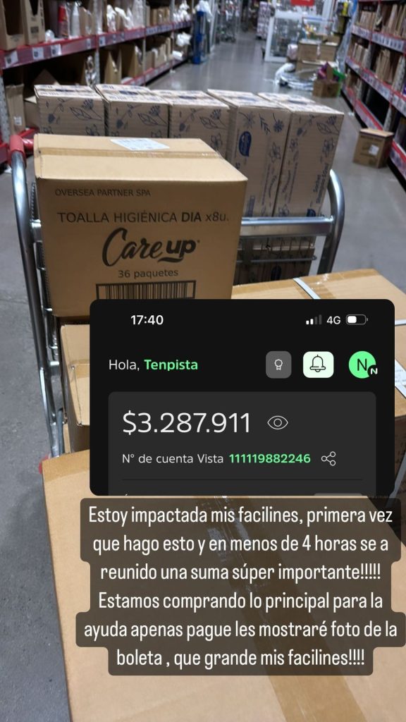 "Estoy impactada mis facilines, primera vez que hago esto y en menos de 4 hora se ha reunido una suma súper importante. Estamos comprando lo principal para la ayuda. Apena pague les mostraré foto de la boleta. ¡Qué grandes mis facilines!", dijo.