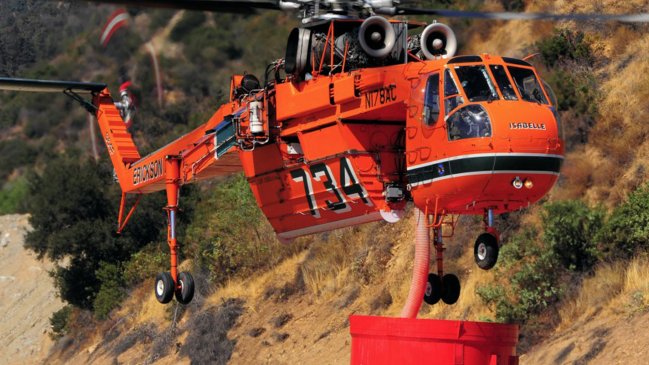 El helicóptero Sikorsky S-64 SkyCrane, también conocido como "Elvis", el cual fue contratado por el Gobierno junto a la Corporación Nacional Forestal (Conaf), llegó durante este miércoles al país.