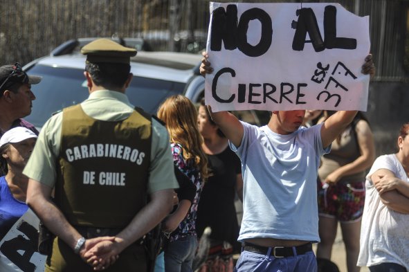 Vecinos de Cerro Navia protestaron por el cierre de colegios municipales de la comuna, en medio de la ceremonia de colocación de la primera piedra del Proyecto Mapocho 42K, encabezada por el Presidente de la República, Sebastián Piñera.