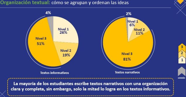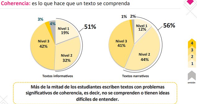 Respecto de la coherencia de los textos, es decir, las relaciones de sentido entre las diferentes ideas, el 45 por ciento de los textos informativos escritos por los estudiantes son comprensibles, pues tienen un sentido claro, todas las ideas están enfocadas en el tema y se relacionan entre sí. Lo mismo ocurre con el 42 por ciento de los textos narrativos.