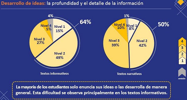 Finalmente, el desarrollo de ideas corresponde a la profundidad y detalle con que se entrega la información, y permite al lector recrear o imaginar aquello sobre lo que se informa o narra. E los textos informativos el 64 por ciento desarrolla el tema de manera básica o sólo enuncia sus ideas, y en los textos narrativos la mitad de los estudiantes desarrolla los temas de manera básica o con dificultad.