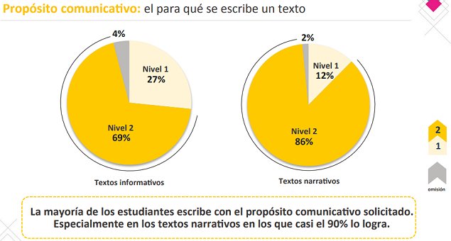 El propósito comunicativo es la intención, el para qué se escribe un texto. Así, mientras que el propósito narrativo es contar una historia, el propósito informativo se trata de describir, exponer o explicar un tema. En este criterio de evaluación la mayoría de los estudiantes escribe con el propósito solicitado, tanto para textos narrativos (86 por ciento) como informativo (69 por ciento).