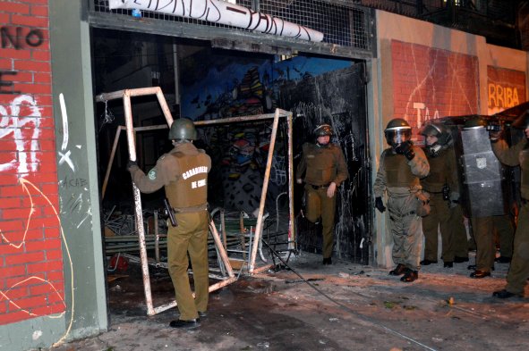 Un numeroso contingente de Carabineros ingresa durante la madrugada de este jueves al liceo Darío Salas de Santiago, para desalojar a los estudiantes que mantenían tomado este recinto.