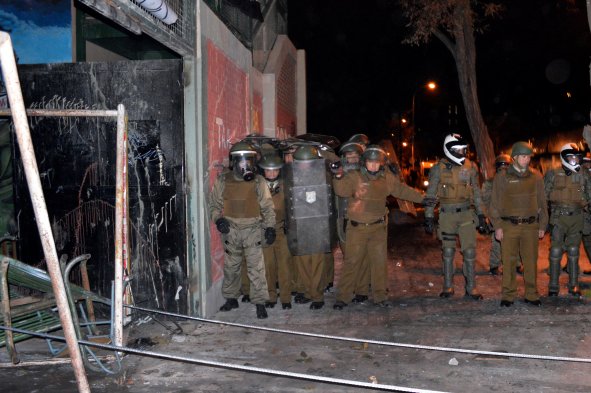 Un numeroso contingente de Carabineros ingresa durante la madrugada de este jueves al liceo Darío Salas de Santiago, para desalojar a los estudiantes que mantenían tomado este recinto.