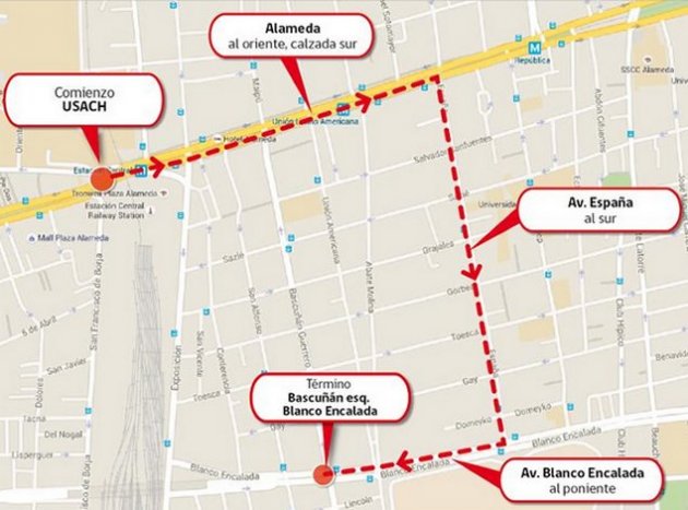 | El trazado visado por las autoridades comienza en el frontis de la Universidad de Santiago, en la comuna de Estación Central, para avanzar al oriente por la calzada sur de la Alameda, luego doblar al sur por Avenida España, enfilar por Blanco Encalada y finalizar en Bascuñán Guerrero.