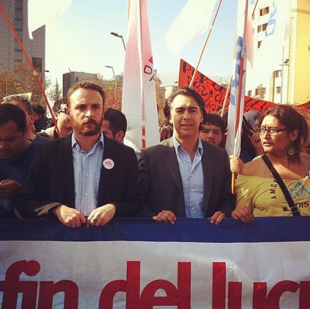 20140508141122 | El diputado y ex presidente de la FECh 2012 Gabriel Boric participó en la marcha estudiantil capitalina. En la foto junto al vicepresidente FECh 2011 y ex candidato a diputado, Francisco Figueroa. (Foto: UPI)