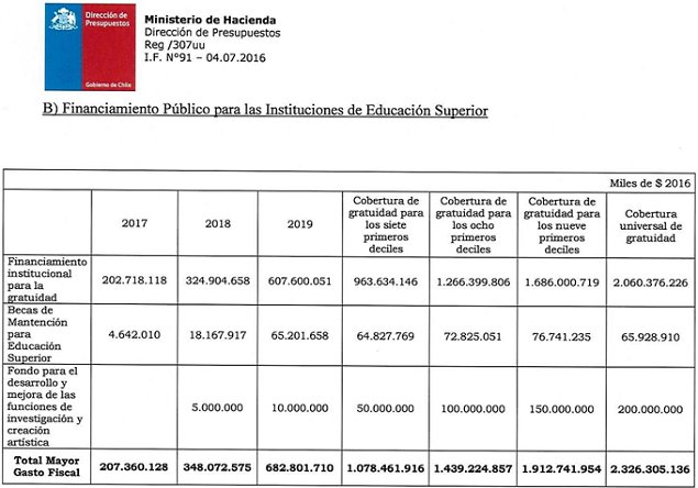 Asimismo, detalla el "mayor gasto fiscal" que supone el financiamiento público para las instituciones de educación superior a contar del próximo año y hasta la "cobertura universal de la gratuidad", que calcula en 2.326.305.136.000 pesos; 2,3 billones de pesos actuales.