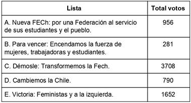 De esta manera, siguiendo lo establecido en los estatutos de la FECh, se constituyó una directiva transitoria conformada por Emilia Schneider y Nicole Martínez (ambas de la lista C) y Millaray Huaquimilla (Lista E), quienes representan las mayores votaciones.